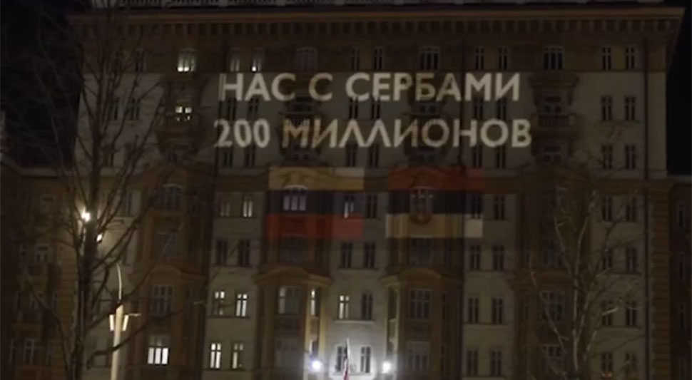 24.03.2022. | 13:18Nas i Srba 200 miliona, poruka je koja je prikazana na Ambasadi SAD u Moskvi povodom 23 godine od početka NATO agresije bombardovanja Jugoslavije.