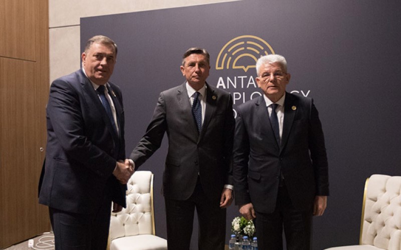 11.03.2022. | 19:32Srpski i bošnjački član Predsjedništva Milorad Dodik i Šefik Džaferović razgovarali su danas na marginama Antalijskog diplomatskog foruma sa predsjednikom Slovenije Borutom Pahorom kome su zahvalili z…