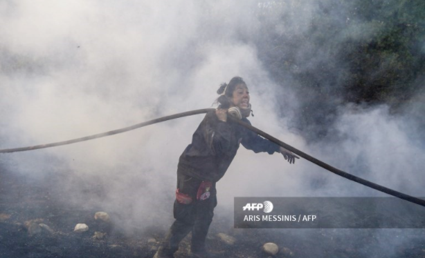 07.08.2021. | 17:26Grčka volonterka Katerina Jonadiju sa crijevom u rukama i licem crnim od dima uz veliki napor pokušava da, rame uz rame sa profesionalnim vatrogascima, na prvoj liniji odbrane od požara u Grčkoj spase…