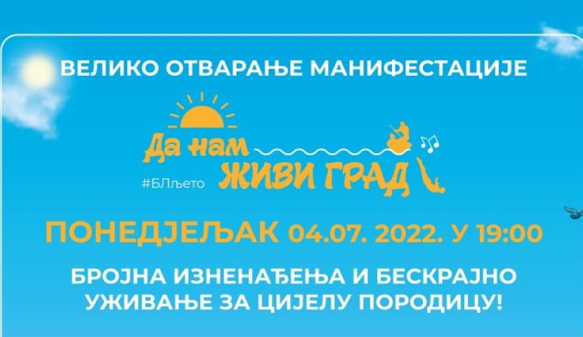 04.07.2022. | 10:10Pod sloganom „Da nam živi grad“, večeras, 4. jula biće otvorena manifestacija Banjalučko ljeto, koja donosi različite vidove sportsko-rekreativnih i zabavnih sadržaja za sve generacije naših sugrađana…