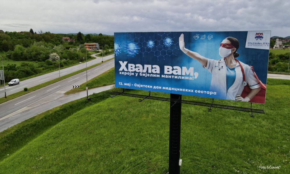 12.05.2021. | 12:51Povodom obilježavanja Međunarodnog dana medicinskih sestara i tehničara, Grad Banjaluka je na bilbordu u blizini prijedorske petlje odao priznanje i izrazio zahvalnost herojima u bijelim mantilima, ko…