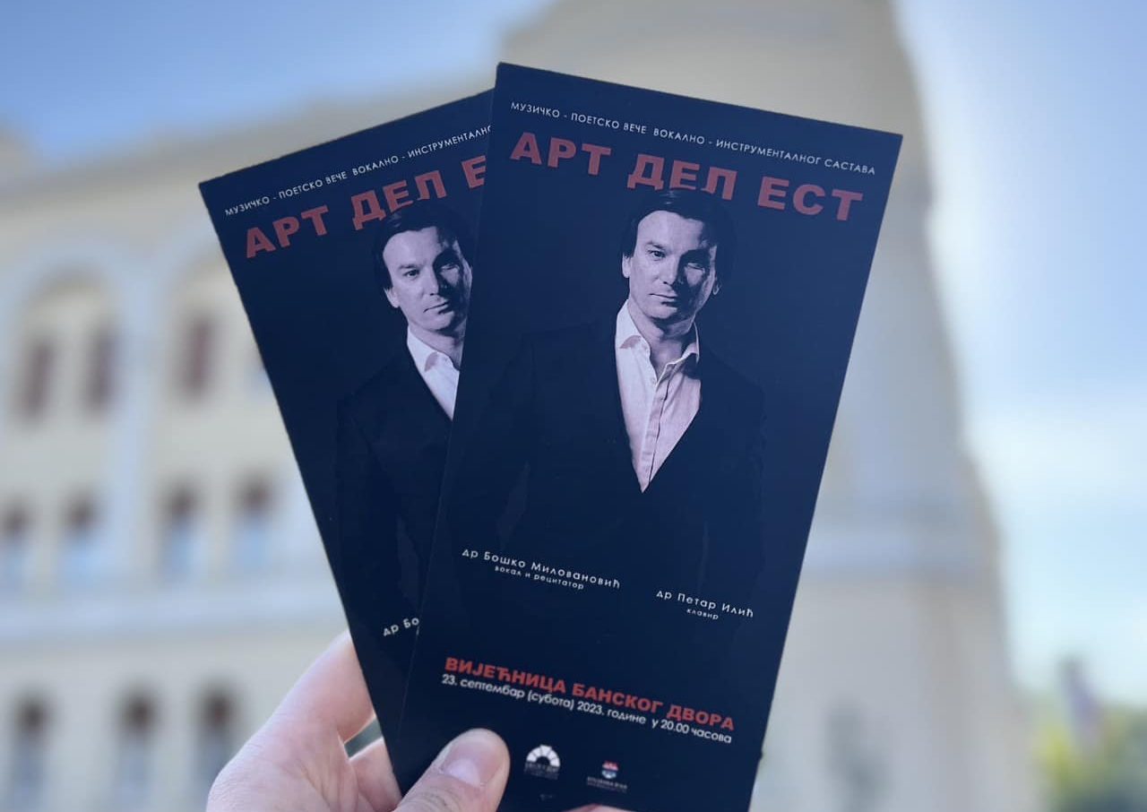 17.09.2023. | 08:39Muzičko – poetsko veče vokalno-instrumentalnog sastava Art Del Est biće održano u subotu, 23. septembara sa početkom od 20.00 časova u Vijećnici Kulturnog centra Banski dvor.