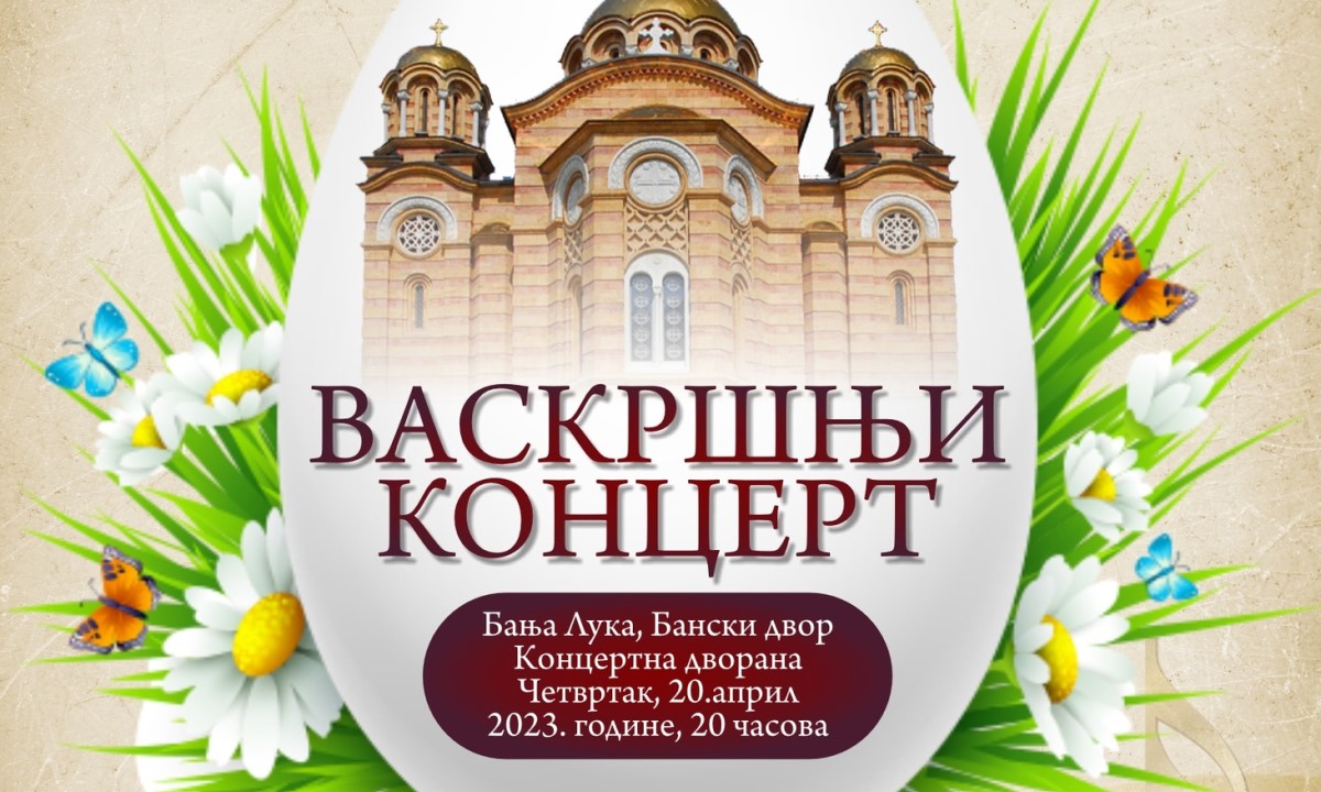 19.04.2023. | 20:17Povodom Vaskrsa, najradosnijeg hrišćanskog praznika, Srpsko pjevačko društvo Banja Luka organizuje Vaskršnji koncert u četvrtak, 20. aprila sa početkom u 20.00 časova u Kulturnom centru Banski dvor. N…
