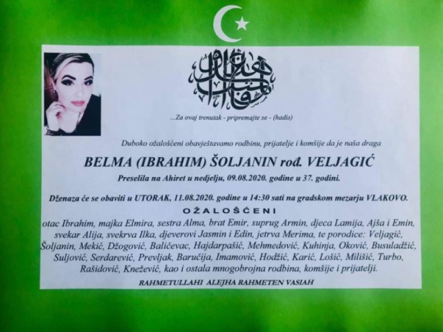 10.08.2020. | 18:52Sahrana Belmi Šoljanin obaviće se sutra, 11. avgusta, na gradskom groblju Vlakovo.