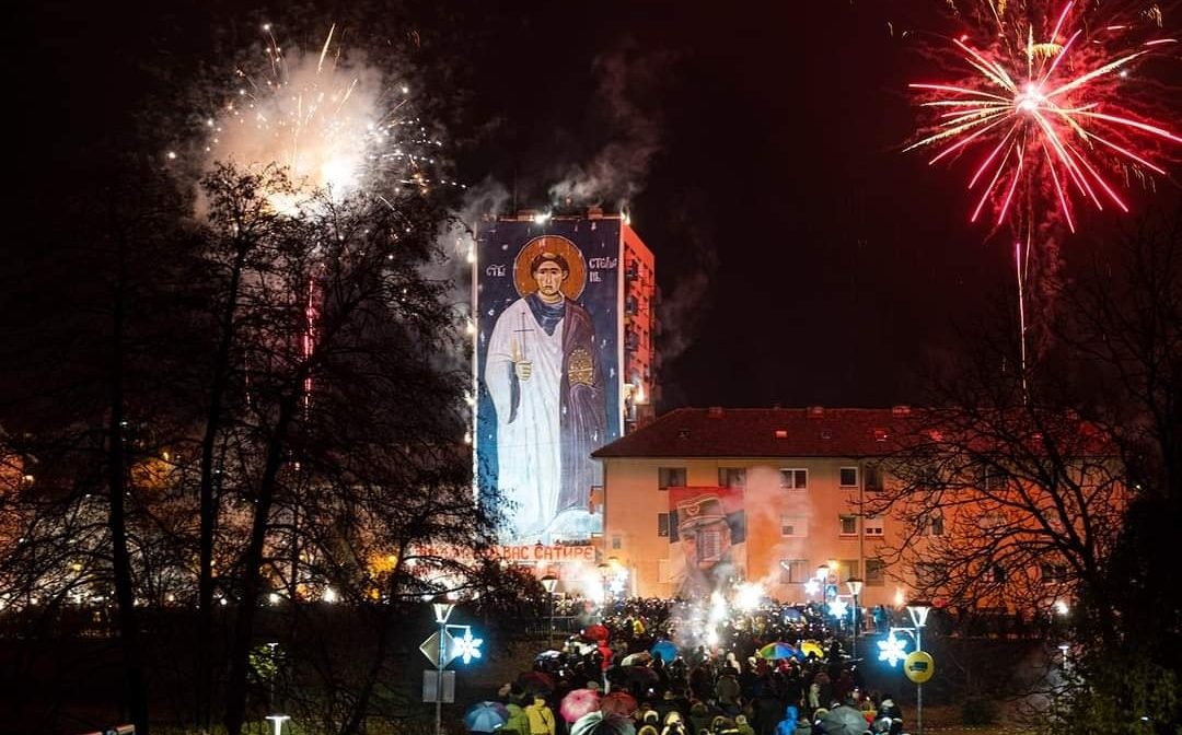 08.01.2022. | 20:25Najvijači Crvene zvezde fočanske “Delije” čestitali su dan Republike Srpske razvijanjem ikone Svetog arhiđakona Stefana na višespratnici na Trgu 9. januara.