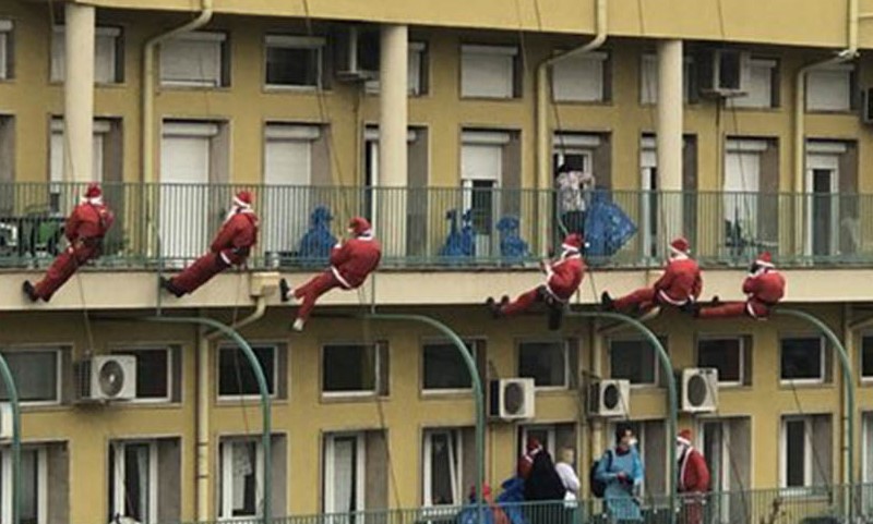 30.12.2021. | 09:22Djeda Mraz se konopcima spustio sa krova dječije bolnice u Tiršovoj i ubacio poklone kroz prozor. Međutim, nije bio sam! Još petorica njegovih kolega su na isti način donijela paketiće za mališane.
