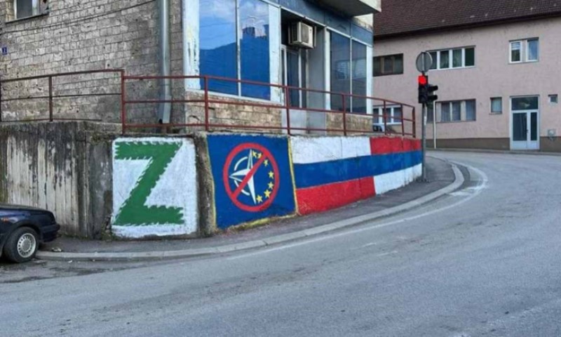 12.04.2022. | 09:09U višegradu su napravljeni grafiti podrške Rusiji. Osim rusko-srpske zastave, oslikana je i prekrižena zastava NATO saveza i EU, kao i univerzalno slovo Z, kao simbol podrške Rusiji.