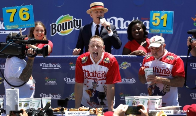 05.07.2021. | 18:12Kralj hot dogova, Joey Chesnut, u nedjelju je nadmašio vlastiti rekord tako što je pojeo 76 peciva s hrenovkama na godišnjem Nathanovom takmičenju u jedenju hot dogova.