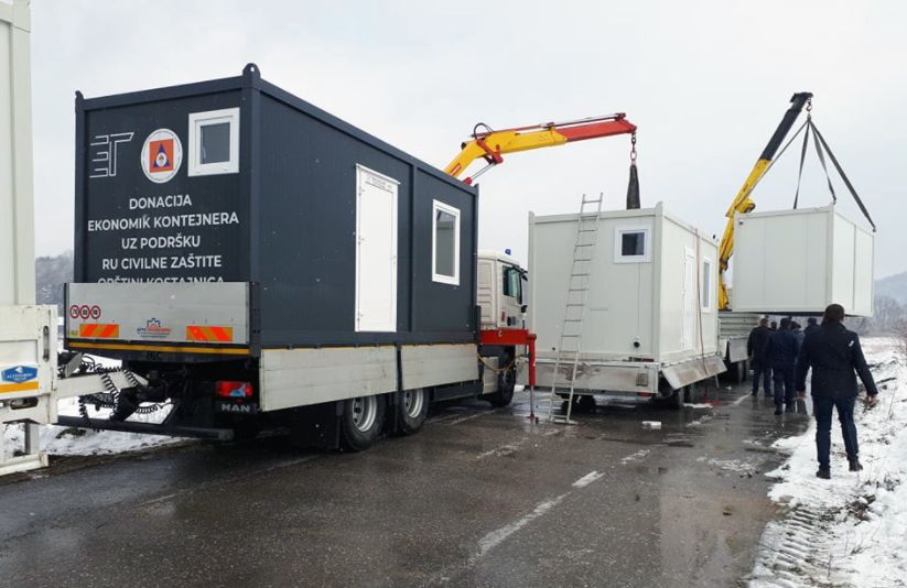 16.01.2021. | 20:44U Kostajnicu su stigla četiri stambena kontejnera od kojih je tri obezbjedila Vlada Srpske i jedan kontejner obezbijedio je privatni preduzetnik.
