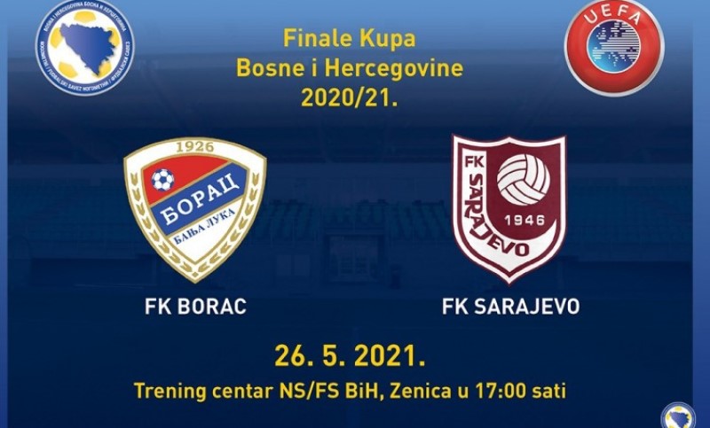 18.05.2021. | 16:49Finalni susret Kupa Bosne i Hercegovine u kojem će se sastati fudbaleri Borca i Sarajeva biće odigran 26. maja u Trening centru Nogometnog / Fudbalskog saveza BiH u Zenici sa početkom u 17 časova.