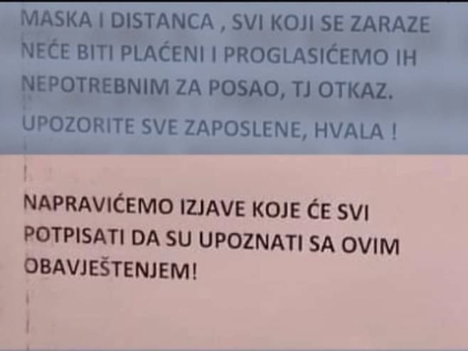 03.07.2020. | 22:17U jednom banjalučkom marketu osvanulo je prijeteće upozorenje radnicima – ko se zarazi koronom dobiće otkaz. Anonimne prijave već su stigle do sindikata i Republičkog inspektorata koji najavljuje izla…