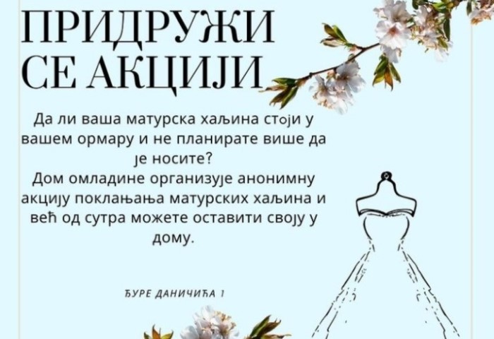 16.03.2023. | 09:13Drugu godinu zaredom Dom omladine pokreće akciju “Pokloni svoju matursku haljinu”, saopšteno je iz Gradske uprave. “Da li vaša maturska haljina stoji u ormaru i ne planirate da je nosite? Organizujemo…