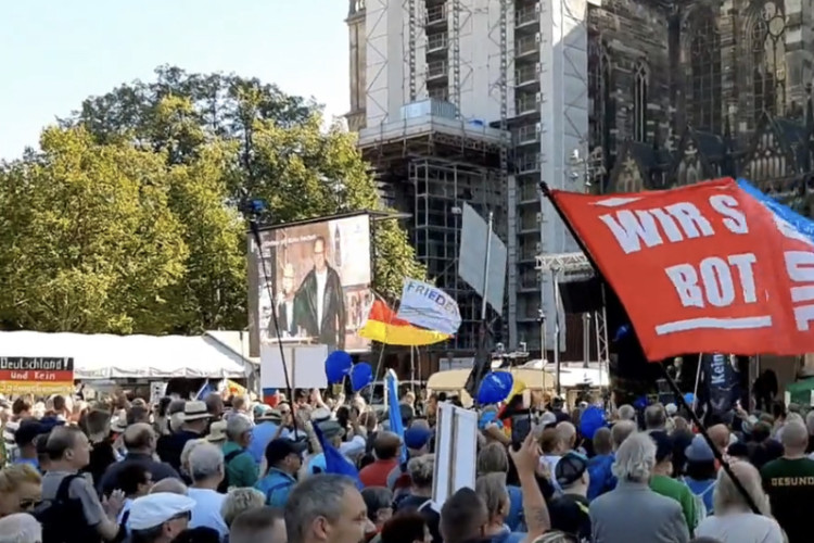 03.10.2023. | 19:48Oko 4.000 ljudi prisustvovalo je danas mitingu u Berlinu sa kojeg su se izjasnili protiv slanja oružja Ukrajini, kao i za ostavku Vlade Njemačke i vanredne izbore u zemlji, saopštila je njemačka polic…