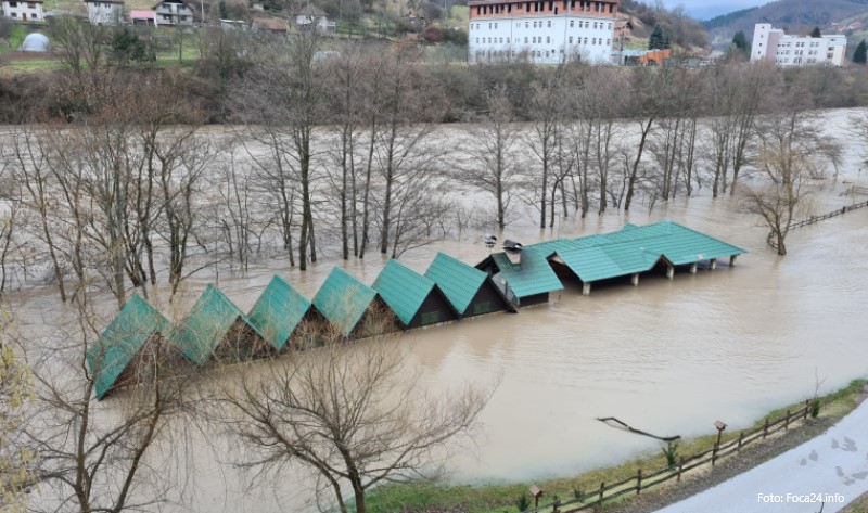 11.02.2021. | 18:25Rijeka Drina poplavila je kamp kućice u naselju Patkovina, kilometar nizvodno od Foče, a rijeka Ćehotina izlila se na ušću u Drinu, ali je u poslijepodnevnim časovima nivo vode počeo blago da opada, p…