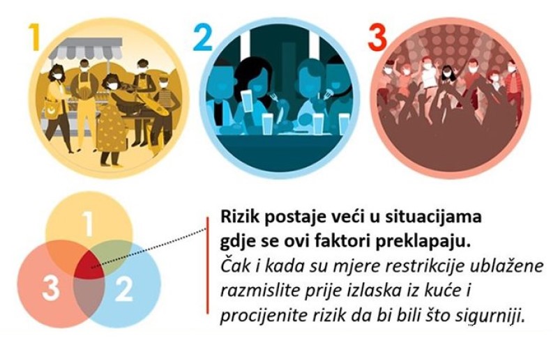 20.07.2020. | 09:40Svjetska zdravstvena organizacija napravila je novu grafiku koja pokazuje koji su faktori koji povećavaju rizik prenosa virusa korona.