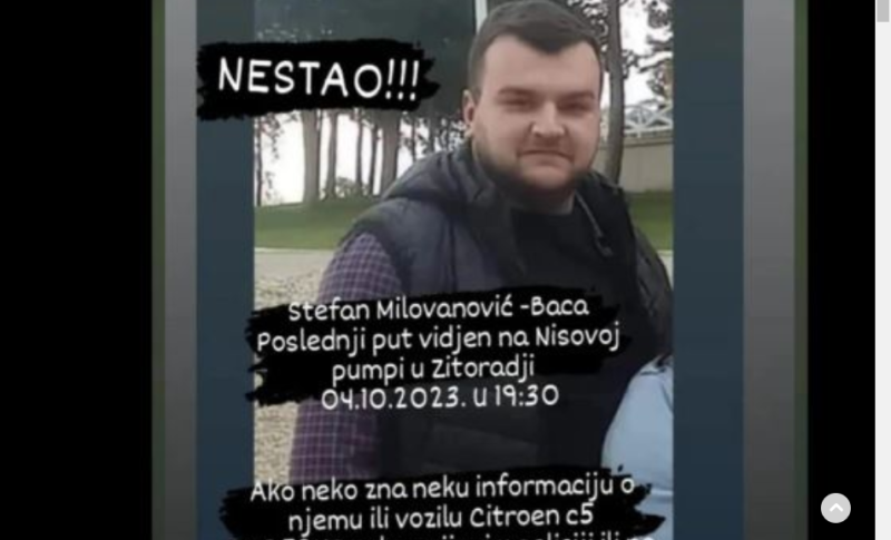 05.10.2023. | 18:37Stefan Milovanović (28) iz Prokuplja koji je nestao 4. oktobra pronađen je danas u Nišu. Kako je izjavio njegov brat Dušan (23), Stefan je pronađen živ u Nišu, a policija trenutno obavlja sve neophodn…
