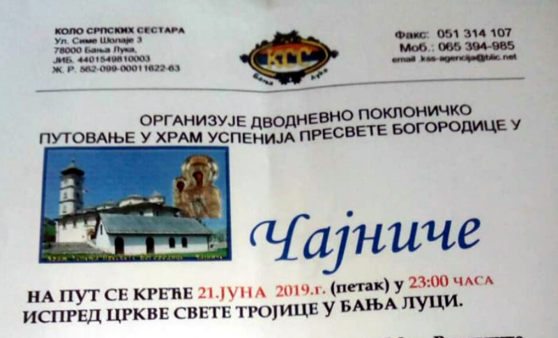 17.06.2019. | 13:18Kolo srpskih sestara iz Banjaluke organizuje pokloničko putovanje u manastir Čajniče (Čajnička Krasnica) sa polaskom 21.06.(petak) u 23:00h ispred crkve Sv. Trojice.