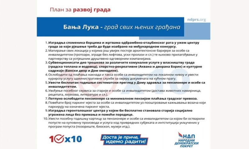 29.10.2020. | 15:35Plan Narodnog demokratskog pokreta (NDP) za razvoj Banjaluke uključuje po 10 konkretnih mjera u 10 različitih oblasti, a naročito je posvećen osobama sa invaliditetom, penzionerima, demobilisanim borc…