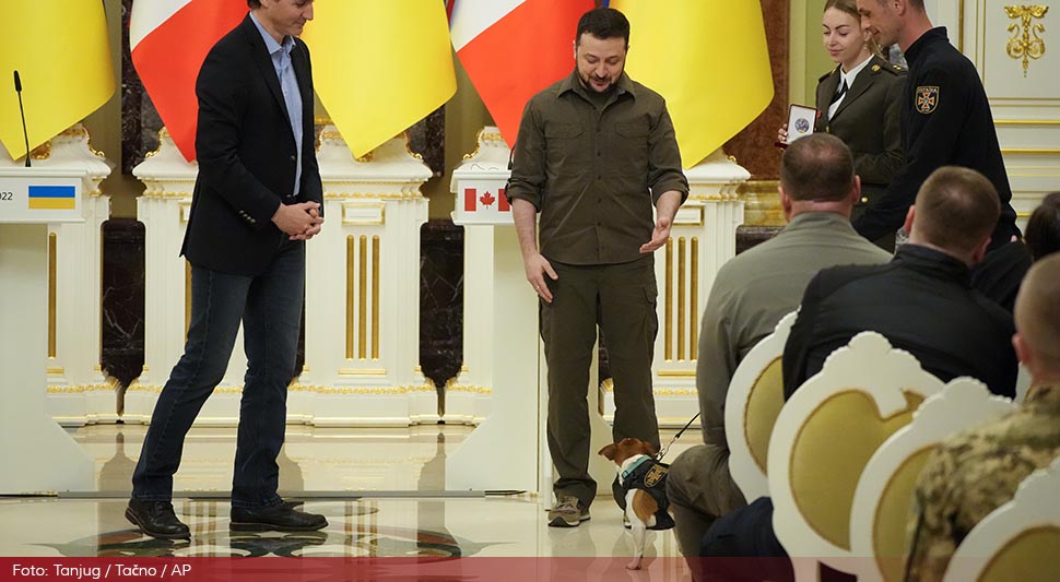 09.05.2022. | 14:52Patronu, dvoipogodišnjem psu Džek Rasel terijeru, predsjednik Ukrajine Volodimir Zelenski je uručio nagradu na svečanosti u Kijevu.